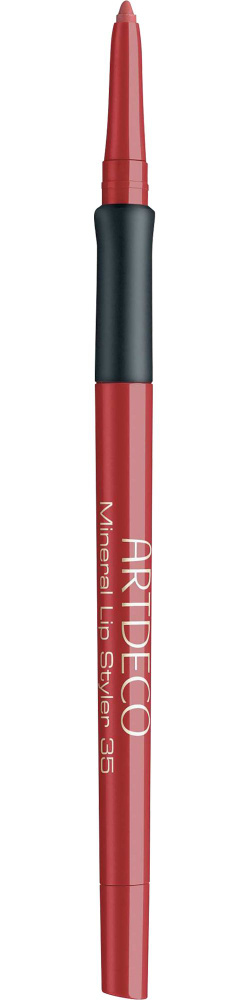 مداد لب مینرال آرت دکو شماره 35 با ماندگاری بالا جلوه ای مات و طبیعی به لبهای شما می دهد. مناسب برای برجسته سازی صحیح خط لب و ایده آل برای پر کردن لبها. در نتیجه رژلب دوام بیشتری داشته و لبها پرتر به نظر میرسند و خشک نمیشوند. این خط لب به گونه ای طراحی شده که مناسب برای لبهای حساس می باشد. این خط لب بهمراه یک تراش عرضه میشود و نوک آن قابل جمع شدن بوده و برای مسافرت بسیار ایده آل است. حاوی هیالورونیک اسید برای رطوبت رسانی به لبها، موم درختی برای ایجاد بافت کرمی و نرم، برای ایجاد اثر درخشش و پوشش مناسب. بدون بو و پارابن و روغن های معدنی.